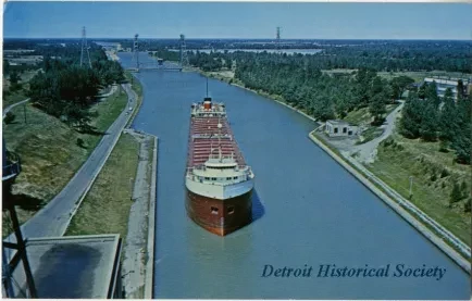 One postcard entitled "T.R.M. LOGAN". The postcard shows a color photographic image of a Canada Steamship Lines freighter making its way through the Welland Ship Canal. A caption on the verso reads, "Flagship of C.S.L. entering Lock No. 4 of the Welland Ship Canal, St. Lawrence Seaway."