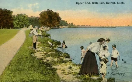 Printed on verso: Upper End, Belle Isle, Detroit, Mich. The Upper End of Belle Isle is a great gathering place for Picnic-Parties. The city has spared no expense making provisions for the amusements of the children.
