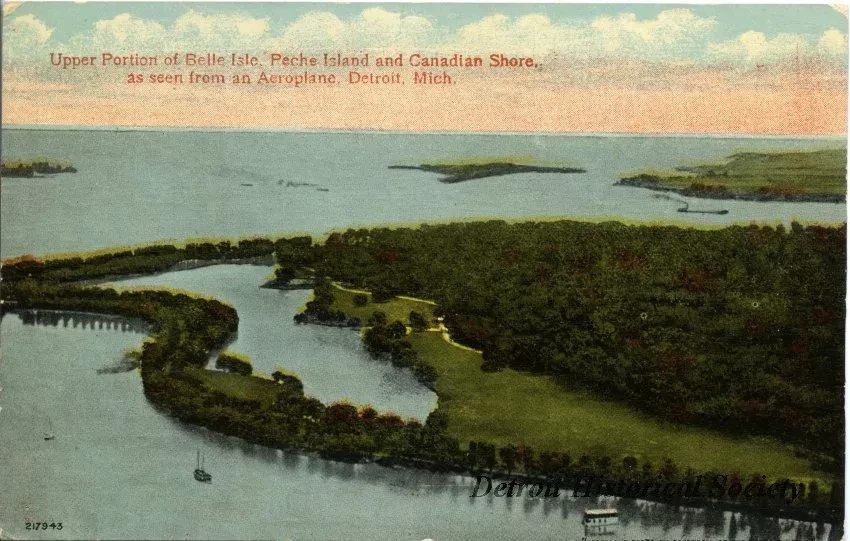 Upper Portion of Belle Isle, Peche Island and Canadian Shore, as seen from an Aeroplane, Detroit, Mich.
