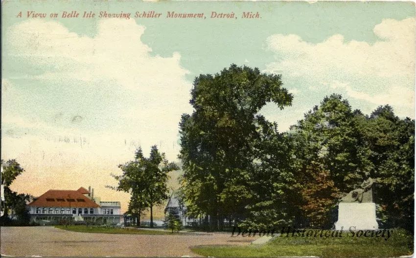 Color postcard depicting the Friedrich Schiller monument by Herman N. Matzen on Belle Isle. In the background is the Detroit Yacht Club.
