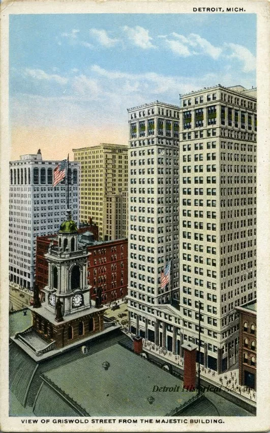 Color postcard depicting an elevated view of Griswold Street, facing southwest. In view are the Ford Building, Dime Building and City Hall.