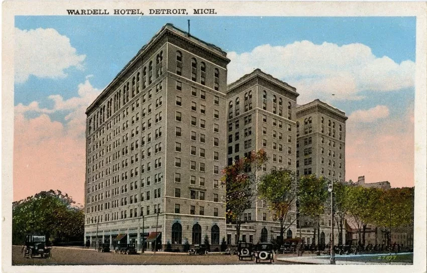 Color Postcard depicting the Wardell Hotel on the corner of Woodward Avenue and E Kirby Street, with several cars in front.