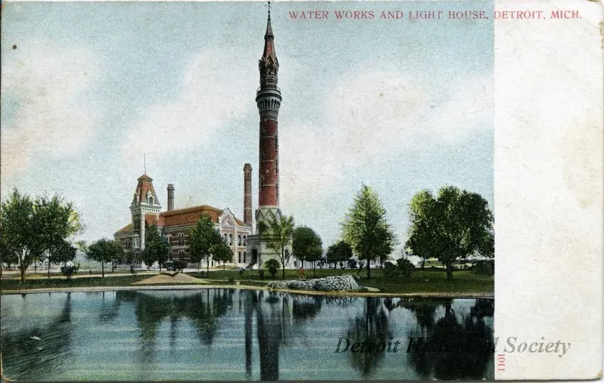 Request ImageColor postcard depicting Water Works Park, with the tower and pumping station in the background and water in the foreground.