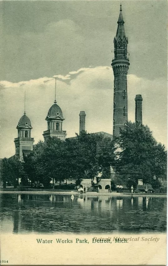 Monochromatic postcard depicting Water Works Park, with the tower, pumping station, drinking fountain, and people in view and water in the foreground.
