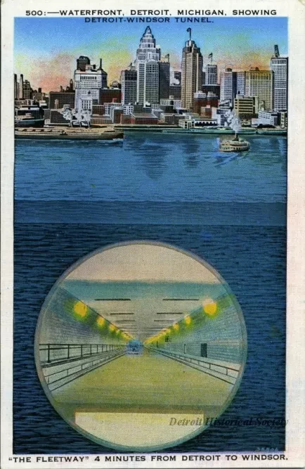 Color postcard depicting the downtown skyline with ships near the riverfront and the Detroit River in the foreground. Inset is an image depicting a vehicle traveling along the Detroit-Windsor Tunnel.