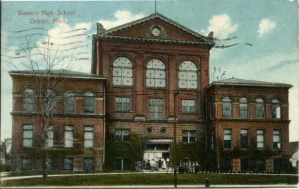 Color postcard depicting Western High School from Scotten Street, with a crowd of people standing at the entrance.