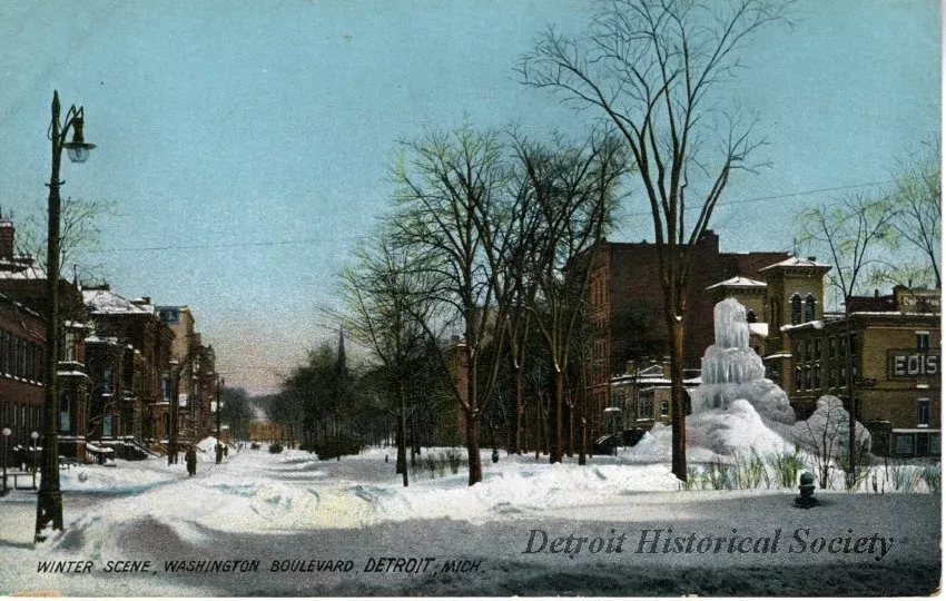 Printed on verso: Winter scene on Washington Boulevard. One of the unique features of Detroit in winter is the famous ice fountain on Washington Boulevard. Several jets of water are allowed to play all winder, and the result is a massive berg of ice which sometimes reaches a height of nearly thirty feet, and contains many tons of the crystal. The scene pictured shows the Boulevard on a snowy morning.