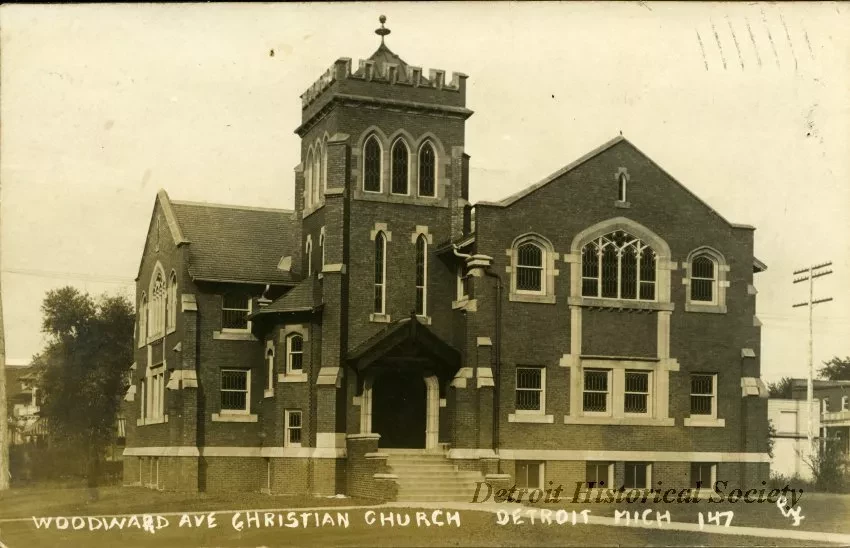 Black and white photographic postcard depicting the Woodward Avenue Christian Church.
