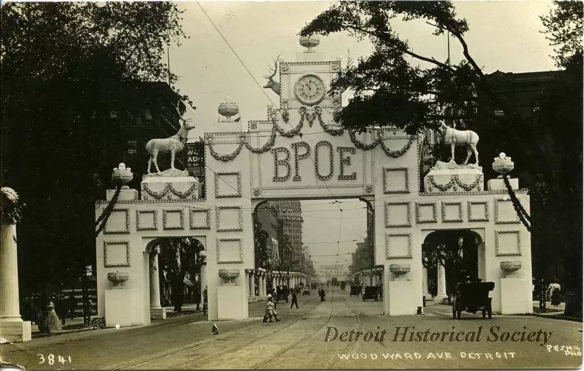 Black and white photographic postcard depicting a decorative arch for the Elks National Convention parade on Woodward Avenue in Grand Circus Park. In the background is the Pontchartrain Hotel.