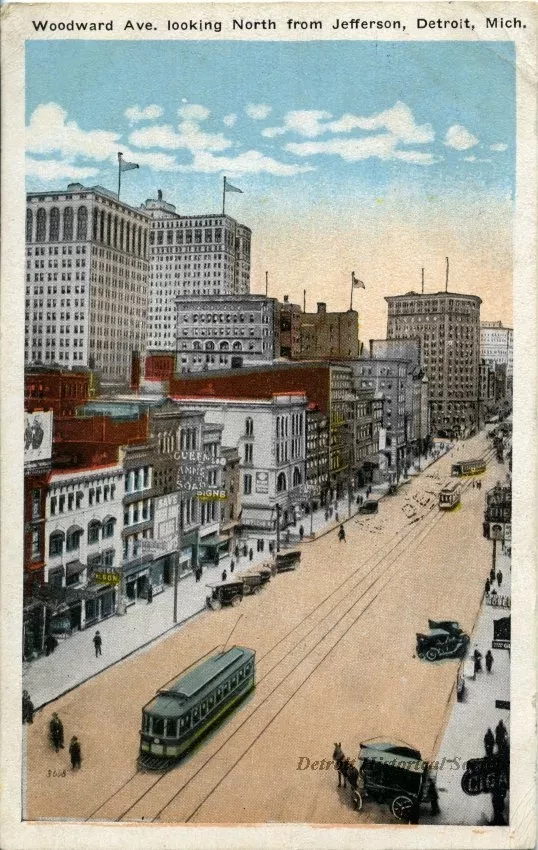 Printed on verso: Woodward Avenue enjoys the unusual distinction of being both Detroit's leading busness and res'dence street. It is named in honor of Judge Woodward, one of Detroit's foremost citizens in the pioneer days, and stretches approximately north and south. At the foot are the ferry docks where boats leave regularly for Windsor, Ont., Belle Isle and Bois Blanc Island.