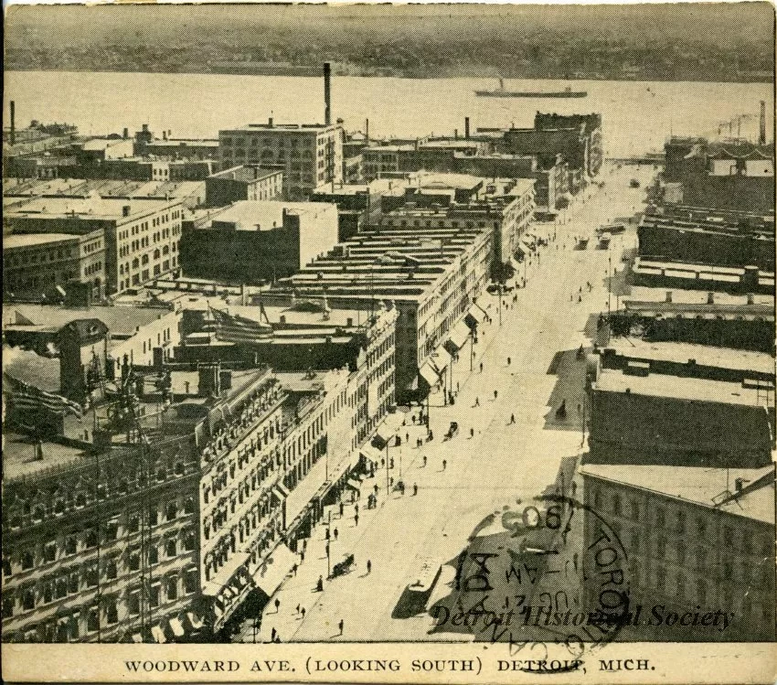 Square Black and white postcard depicting an elevated view along Woodward Avenue from Campus Martius, facing southeast. In view are commercial buildings, pedestrians, and a ship on the Detroit River.