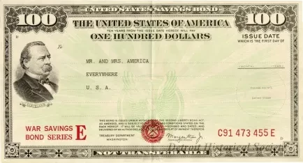 1 - War Savings Bond poster printed to resemble a large $100 War Saving Bond Series E note. The design includes a portrait of President Grover Cleveland. The bond is made out to "Mr. and Mrs. America, Everywhere, U.S.A."