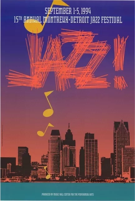 1 - Advertisement poster from the 15th Annual Montreux Detroit Jazz Festival that was held September 1-5, 1994. The poster shows a multicolor drawing of the skyline of the City of Detroit at night. The word: "JAZZ," is shown in bright red text across the top of the poster. Printed text at the bottom shows: "Produced by Music Hall Center for the Performing Arts." Small printed text at the left edge shows "Design and Production: The Davis-Martin Group / Photography: Bruce Griffen."