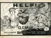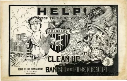 Informational poster issued by the Fire Prevention Bureau of the Detroit Fire Department's Board of Fire Commissioners, and designed by the Sprunk Engraving Company bearing the message, "Help! Stop this fire waste. It's your duty. Clean up and banish the fire demon," and a black and white illustration of a woman identified by her headband as Miss Detroit reaching toward the viewer against a background of the city on the left, and a dragon holding a cornucopia from which buildings spill out into flames that rise from a burning money bag on the right. The words, "disorder," "carelessness," "rubbish," "suffering," "destruction," and "death" emerge from the dragon's nostrils, and it brandishes a sword emblazoned with the word "ruin." The sign is mounted on linen.