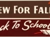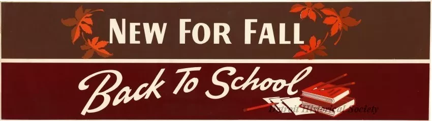 1 - Poster advertising fall shopping printed on thin paper. The poster contains two lines of text the first line in white text on the upper half of the poster reads: "NEW FOR FALL" on a brown background, surrounded by autumn leaves. The second line in white text on the lower half of the poster reads: "Back To School" on a plum colored background with two books, three sheets of paper, and three pencils to the right of the text. The top and bottom halves of the poster are separated by a white border.