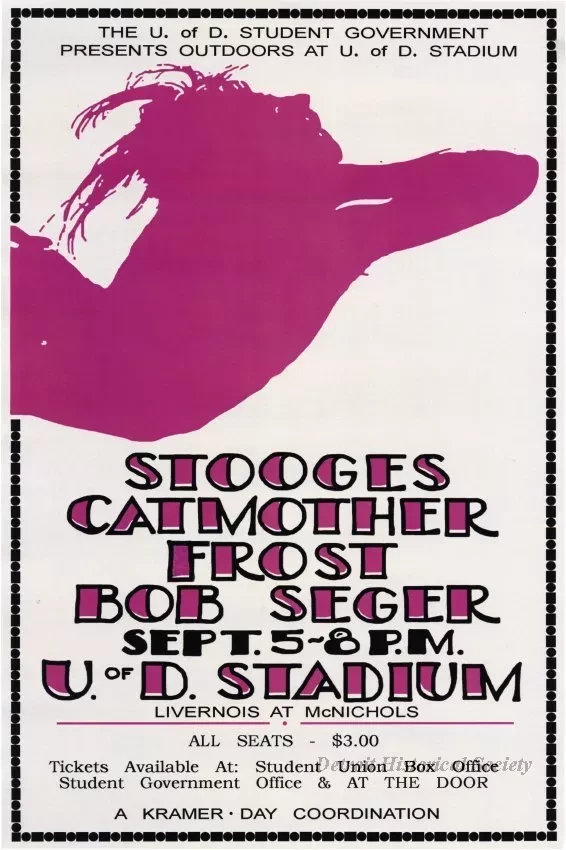 1 - Reproduction of a concert poster for a performance by: "Stooges Catmother Frost Bob Seger Sept. 5 8 P.M. U. of D. Stadium Livernois At McNichols", presented by the University of Detroit student government. The poster is printed in pink and black against a grey background, and features a sideways pink silhouette, presumably of Iggy Pop, with his back arched and elbow pointed upward. "All Seats - $3.00", the poster is printed on glossy paper.