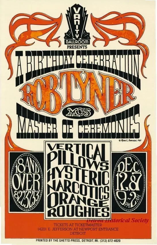 1 - Screen printed promotional poster, designed by Mark Arminski, for the December 12, 1987 birthday celebration of the MC5's Rob Tyner at the Vanity Ballroom, featuring performances by the Vertical Pillows, Hysteric Narcotics, and the Orange Roughies. The poster is printed in black and orange on beige paper.