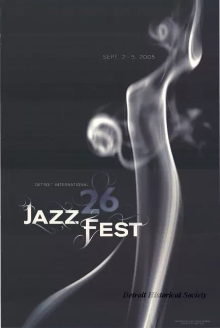 1 - Advertisement poster for the 26th Annual Detroit International Jazz Festival that was held September 2-5, 2005. The poster shows a wisp of rising smoke against a dark purple/black background. Printed text on the lower left side shows: "Detroit International Jazz Fest 26", small printed text in the lower right corner shows: "Sponsored by Mack Avenue Records Produced by Music Hall".