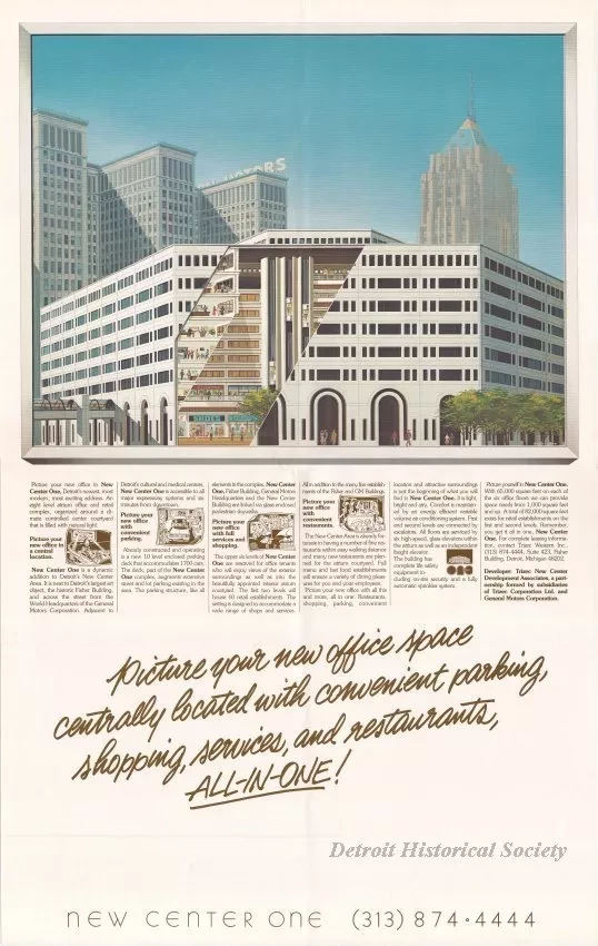 One advertisement poster for "New Center One." The top half of the poster shows a color drawing of the New Center One complex with the General Motors Building and Fisher Building in the background. Brown printed text in the lower portion of the poster advertises the various amenities in the area and encourages businesses to "Picture your new office space centrally located with convenient parking, shopping, services, and restaurants, All-In-One!" The project developer was "Trizec New Center Development Associates, a partnership formed by subsidiaries of Trizec Corporation, Ltd., and General Motors Corporation."