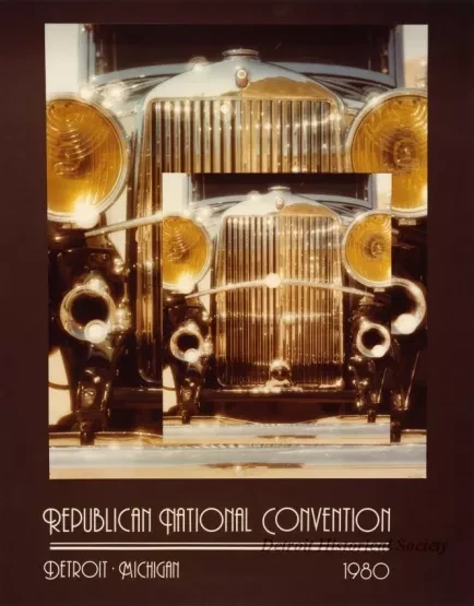 Poster for the 1980 Republican National Convention in Detroit, Michigan. The poster has a brown backing and features an image of the front end of a c. 1930 Graham-Paige automobile.
