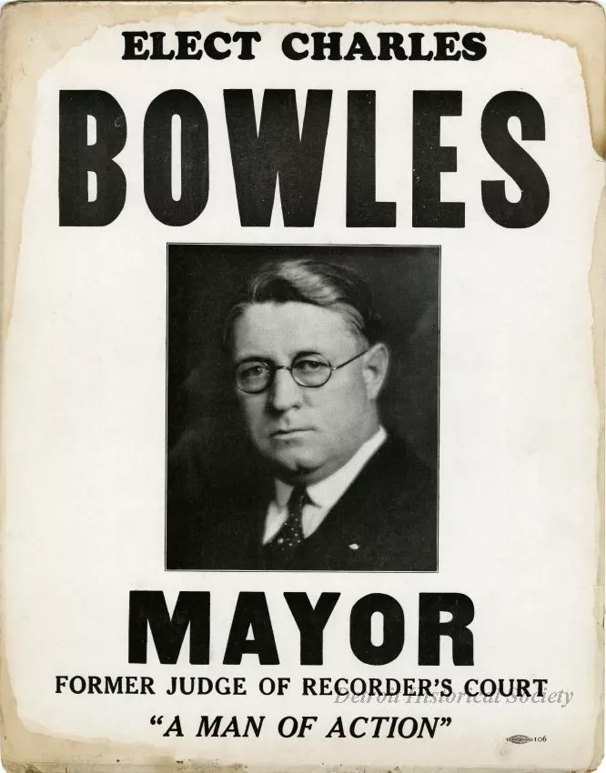 One political advertisement poster with the message, "Elect Charles Bowles Mayor." The poster is printed in black text on white cardboard. A black and white, head and shoulders photographic image of the candidate is printed at the center of the poster. A small "Allied Printing" union label is shown in the lower right corner.