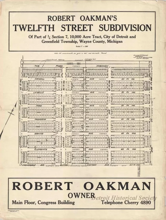 1 - Advertisement poster; White paper with black ink: "Robert Oakman's Twelfth Street Subdivision", shows a platted area of land that is bounded by Davison Ave. on the south, Linwood Ave. on the west, Ford Highway on the north, and 12th Street on the east. The plat map shows lot lines, lot numbers, right-of-way lines, dimensions, and bearings. Printed text along the bottom shows: "Robert Oakman Owner Main Floor, Congress Building Telephone Cherry 4890", small printed text in the lower left corner shows: "Speaker-Hines, Detroit, 12256-2M-4-3-17".