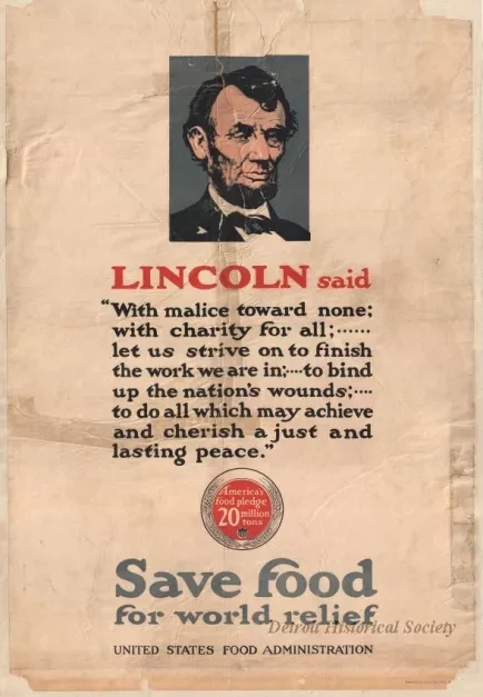 World War I poster with a quote from Abraham Lincoln: "With malice toward none; with charity for all; ... let us strive on to finish the work we are in; ... to bind up the nation's wounds; ... to do all which may achieve and cherish a just and lasting peace." The poster shows a color drawing of Lincoln at the top with text printed in red, black, and gray on a white background. An added message along the bottom of the poster shows "Save food for world relief" and "United States Food Administration." Small printed text in the lower right corner shows "Edwards & Deutsch Litho. Co."