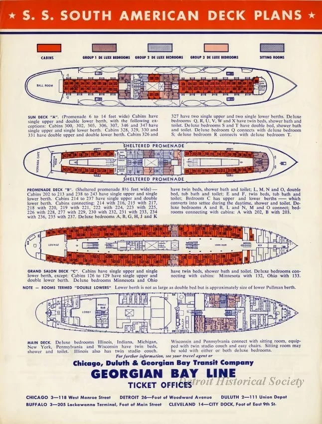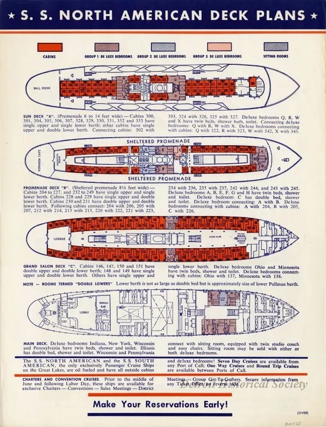 Two-sided poster (and 3 copies), printed in orange and blue ink. One side shows "S.S. South American Deck Plans" and the other "S.S. North American Deck Plans." The plans shown for each include Sun Deck "A," Promenade Deck "B," Grand Salon Deck "C," and Main Deck. The legends at the top of each side shows shading for cabins, group 1 deluxe bedrooms, group 2 deluxe bedrooms, group 3 deluxe bedrooms, and sitting rooms. Text at bottom of the S.S. South American side reads "Chicago, Duluth & Georgian Bay Transit Company / Georgian Bay Line." Text at bottom of the S.S. North American side reads "The S.S. NORTH AMERICAN and the S.S. SOUTH AMERICAN, the only exclusively Passenger Cruise Ships on the Great Lakes, are oil fueled and have all outside cabins and deluxe bedrooms! Seven Day Cruises are available from any Port of Call; One Way Cruises and Round Trip Cruises are available between Ports of Call / Charters and Convention Cruises. Prior to the middle of June and following Labor Day, these ships are available for exclusive Charters - Conventions - Sales Meetings - District Meetings - Group Get-To-Gethers. Secure information from and Ticket office on reverse side. / Make Your Reservations Early!"