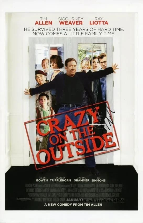 1 - Signed movie poster proof for the 2010 film, "Crazy on the Outside," starring and directed by Tim Allen. The sheet is signed by Tim Allen. The poster concept shows Allen's character barricading a pair of doors using his back. The characters played by Sigourney Weaver, Ray Liotta, J.K. Simmons, Julie Bowen, Karle Warren, Helen Slayton-Hughes, and Kenton Duty peer thought the doors' windows behind him. A Cimarron Group label is affixed the verso, with the number 115, and date October 27, 2009.