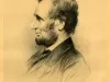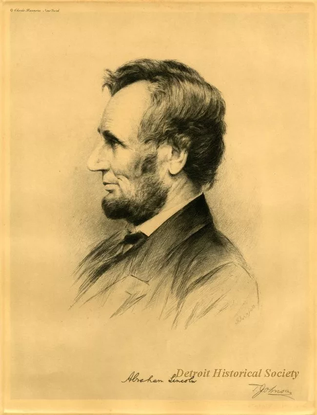 Print reproduction on heavy paper of an engraving of President Abraham Lincoln, originally drawn by T. Johnson. The engraving shows a profile view of President Lincoln from the shoulders up. The original drawing was signed by the artist on the lower right. Text on the upper left corner of the print reproduction reads "(c) Charles Barmore, New York."