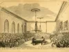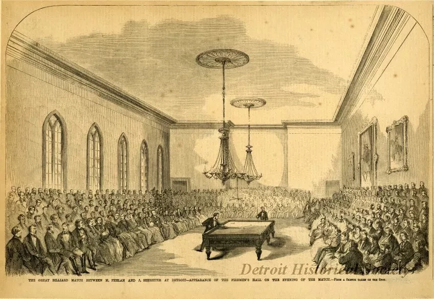 Black and white print of an engraving captioned "The Great Billiard Match Between M. Phelan and J. Seereiter at Detroit - Appearance of the Firemen's Hall on the Evening of the Match, from a sketch taken on the spot," from the April 23, 1859 issue of Franke Leslie's Illustrated Newspaper. The engraving depicts the billiard match between J. Seereiter, from Detroit, and M. Phelan, from New York City, which took place at Detroit's Firemen's Hall on April 12, 1859. The engraving shows the men playing billiards in the center, with a large crowd of spectators watching. Two chandeliers hanging above the billiards table and several paintings on the wall can also be seen inside the Firemen's Hall. The print is mounted on cardboard. The verso of the cardboard mount has taped to it a brief article about the billiards match.