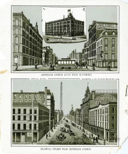 Print containing three engravings, taken from the booklet, Souvenir of Detroit & Exposition, depicting sites in downtown Detroit. The top is captioned "Jefferson Avenue south from Woodward." A streetcar, perpendicular to the tracks is in the center of the road. "James Nall, Carpets" is printed on a building on right side of the street. Set into this image is one of the Chamber of Congress within a frame drawn to resemble a piece of paper hung with nails. The bottom image is captioned, "Griswold Street from Jefferson Avenue." The Campau Block on the west side of Griswold and the Newberry and McMillan Building on the east side are both labeled. A moonlight tower and the spire of City Hall are both visible in the background. Pedestrians and horse-drawn carriages are in the street.
