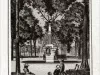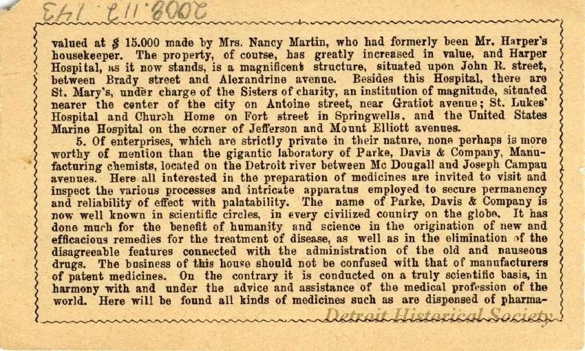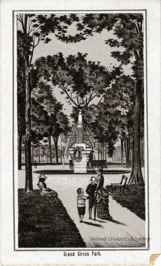 Small print of an engraving depicting the fountain in Grand Circus Park. A woman and two children stand along the path in the foreground. A woman seat on a bench is to their left. Another person is visible in the background, beyond the fountain. The verso contains two partial passages, the first concerns Harper Hospital and several other hospitals in the area. The second is about Parke, Davis, and Company.