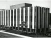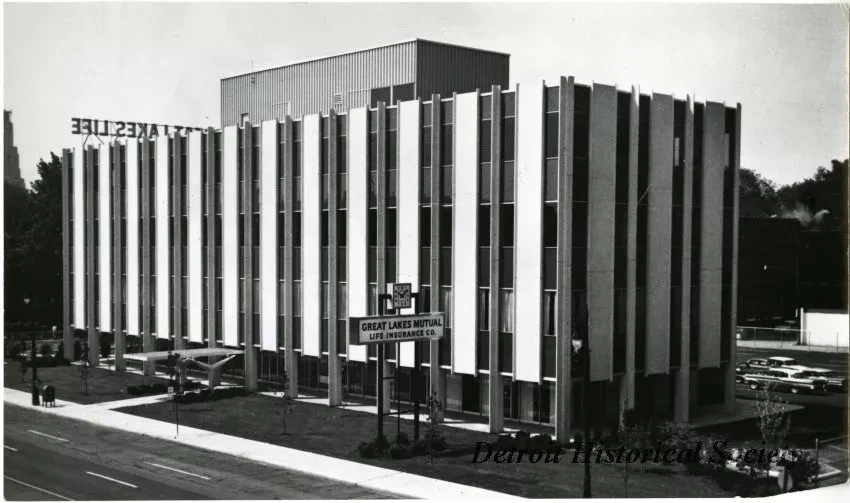 Black and white halftone print of the headquarters of the Great Lakes Mutual Insurance Company on the northwest corner of Woodward Avenue and Euclid Street, as viewed from the northeast. The" Great Lakes Mutual life Insurance" sign with a square clock reading the time of 10:09 is in the center of the photo.