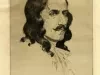Black and white sketch of Antoine Laumet de La Mothe Cadillac by Charles A. Barker. Handwritten text underneath the bottom left corner of the image reads "Cadillac" and the image is signed underneath the bottom right corner. The paper is embossed on the lower left.