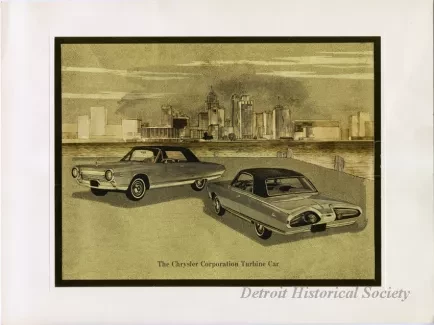 One print of "The Chrysler Corporation Turbine Car." The black ink and gold-colored embossed foil print depicts front and rear corner views of two Chrysler Turbine cars that are parked near the end of a dock that is located on the Canadian side of the Detroit River. The Detroit River and downtown Detroit skyline are visible in the background. The artist's name or marks are not visible. The print is mounted on a heavyweight white matte paper frame.