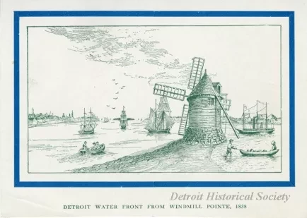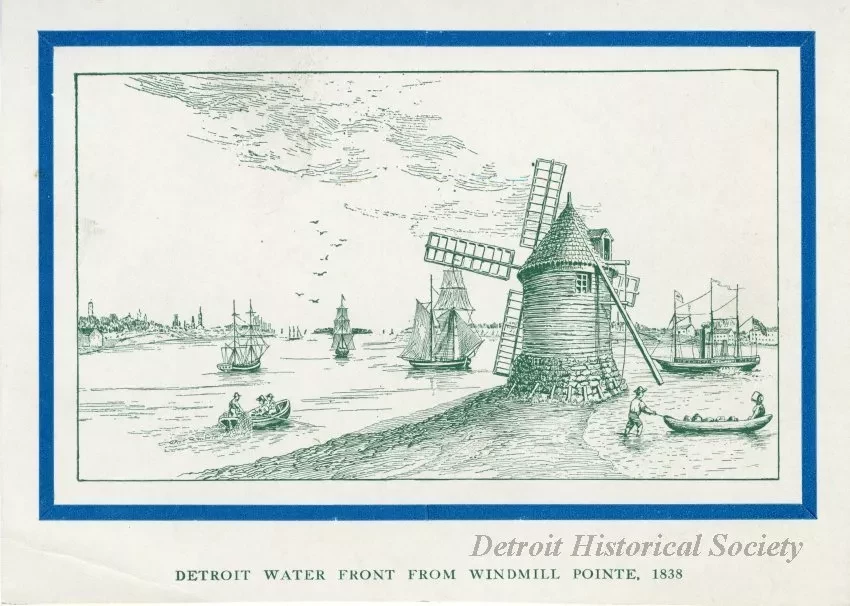 Small green and blue print of an engraving captioned, "Detroit Water front from Windmill Pointe, 1838." The windmill is just right of center on a narrow peninsula. To the right a man pushes off a small boat carrying a woman. On the left another small boat passes, dragging a net. Several large sailing ships and a side wheel steamer are visible in the background. In the distance there are structures on both sides of the river and the eastern tip of Belle Isle between. "L/Views (2)" handwritten on a label affixed to verso.