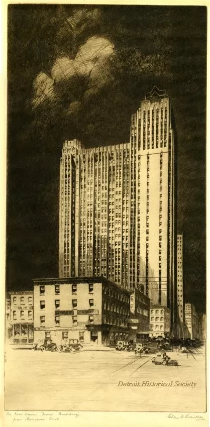 Etching titled "The New Union Trust Building from Congress East," by Charles A. Barker. The etching depicts the New Union Trust (Guardian) Building from East Congress Street with a view to the southwest. The Hotel Congress is also depicted in the foreground of the image. Automobiles are shown parked and driving along Congress Street. The title of the etching is located underneath the bottom left border of the image and artist's signature is located underneath the bottom right border of the image.