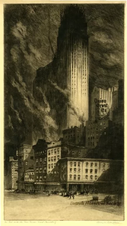 Etching titled "The Old and the New Union Trust Building," by Charles A. Barker. The etching depicts the New Union Trust (Guardian) building under construction, with a view to the southwest. The building appears to be near completion, with work being done on the upper portion of the building. A "Union Trust Co." sign is also shown in the middle of the image to the right. The title of the etching is located underneath the bottom left border of the image, and the artist's signature is located underneath the bottom right border of the image. The print is embossed with the logo of the Crafts Guild of Detroit on the bottom left corner.