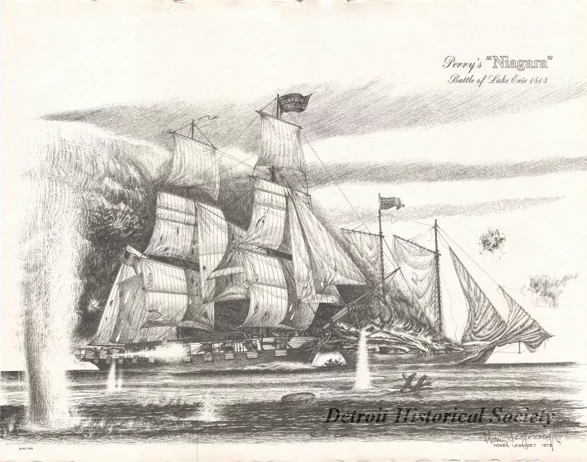 One print of a pen and ink drawing entitled "Perry's 'Niagara,' Battle of Lake Erie, 1813." The print shows a starboard side view of the U.S. Brig Niagara which is engaged in battle with a British vessel that can be seen in the background. Oliver H. Perry's flag with the motto, "Don't Give Up The Ship," is flying at the top of the foremast of the Niagara. The artist, "Homer LaGassey," has signed his name in pen in the lower right corner of the print.