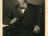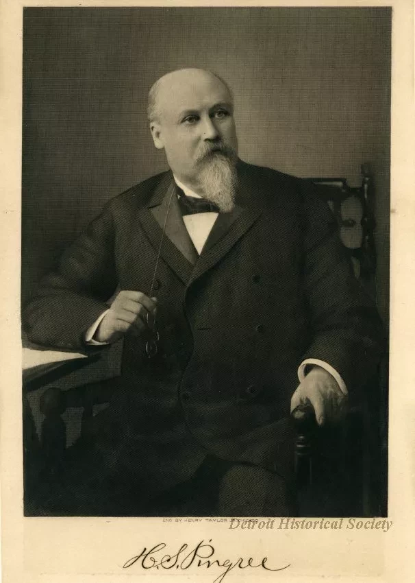 Print of an engraved portrait of Hazen S. Pingree with a straight beard seated in a baluster-backed chair with right arm resting on a table, holding a pince-nez in right hand. Pingree's signature is printed below. The engraving is credited to Henry Taylor Jr. of Chicago.