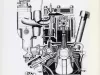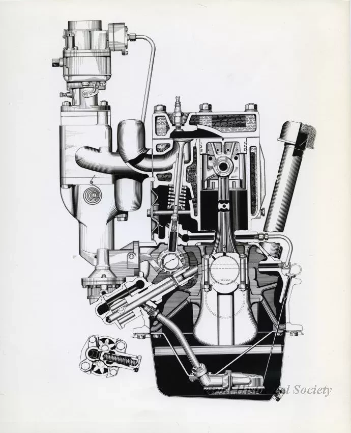 Request ImageBlack and white photo illustration of a Packard car engine, section view.