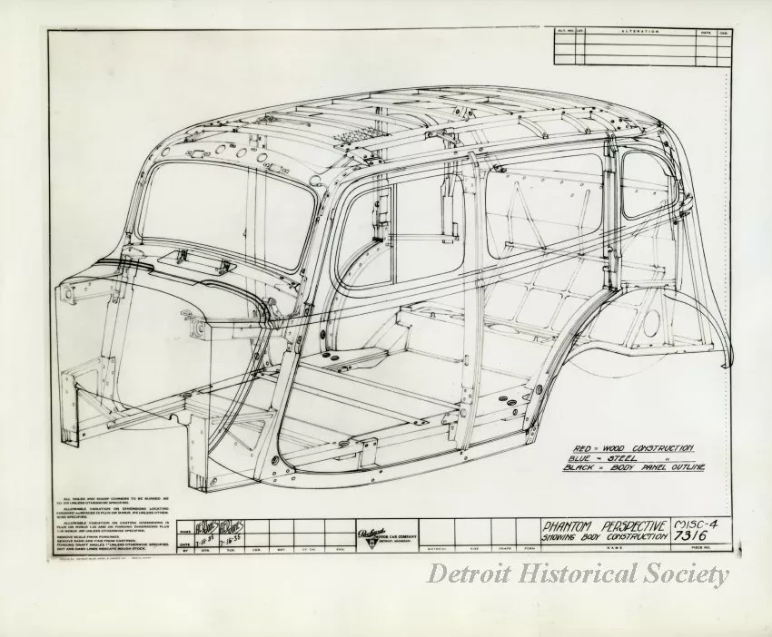 Black and white print of the blueprints for the exterior of a Packard automobile entitled "Phantom Perspective Showing Body Construction". Dated 7-15-1935.
