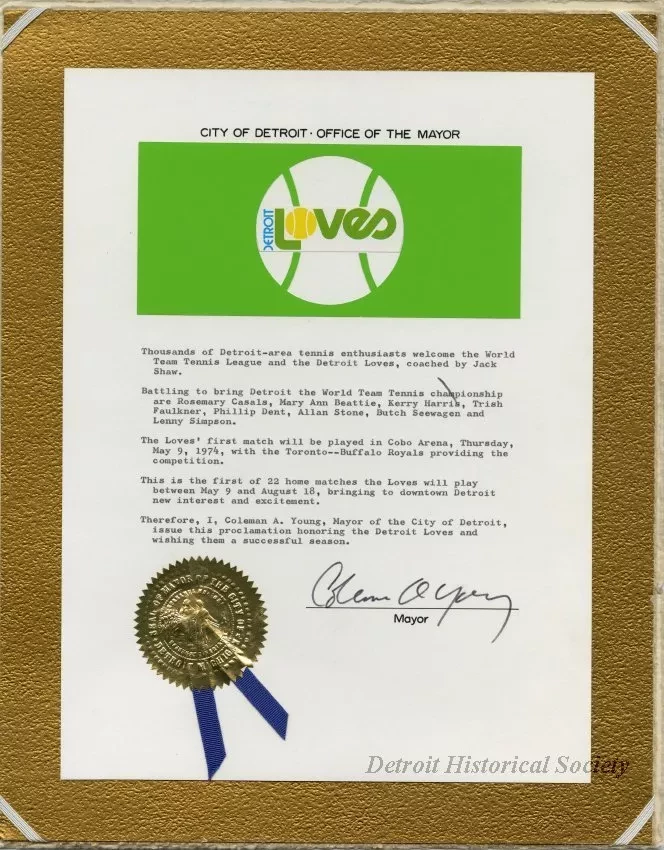 City of Detroit proclamation to honor the World Team Tennis League team the Detroit Loves, signed by Coleman A. Young. The text of the proclamation is as follows: