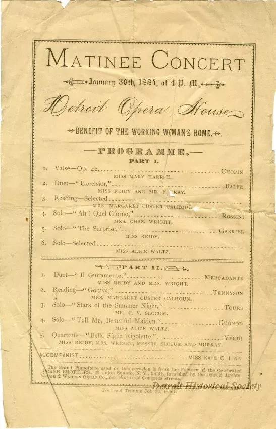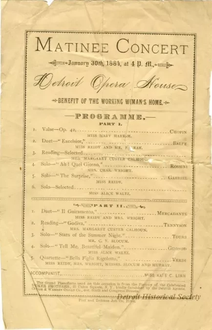 Program for a matinee concert held on January 30, 1884 at the Detroit Opera House as a benefit for the Working Woman's Home. Musical and poetic selections from Chopin, Balfe, Rossini, Gabriel, Mercadante, Tennyson, Tours, Guonod, and Verdi are listed.