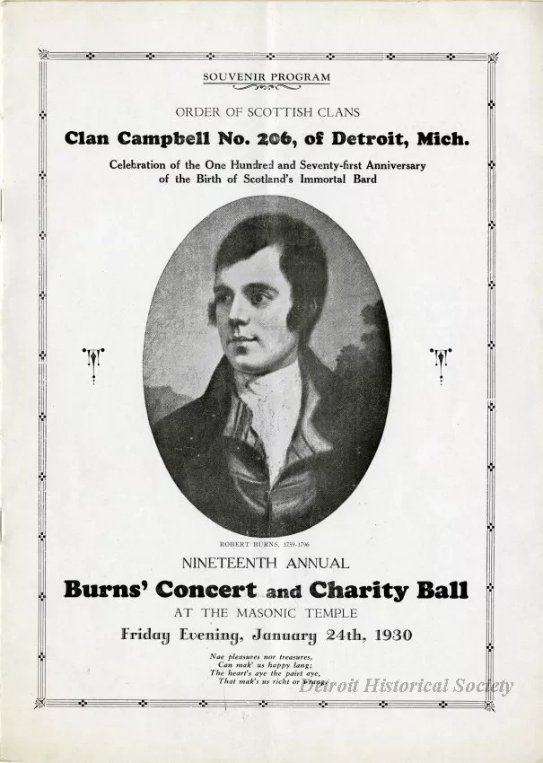 12 page souvenir program for the Nineteenth Annual Burns' Concert and Charity Ball held by Clan Campbell No. 206 of Detroit, part of the Order of Scottish Clans at the Masonic Temple on January 24, 1930. The event was dedicated to the poet Robert Burns, whose portrait is on the cover. The program for the night is printed in a narrow column at the center of each page, surrounded by advertisements, many geared toward people of Scottish heritage such as trips to Scotland, and Scottish foods.