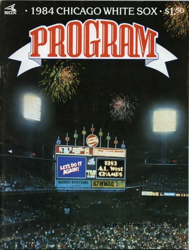 Chicago White Sox program from a game played Saturday Apr. 7, 1984 against the Detroit Tigers. At this game, Tigers pitcher Jack Morris threw a no-hitter. Front Cover features a photo of a fireworks show at Comiskey Park in Chicago, IL. Includes information about future Tigers manager Jim Leyland, then the White Sox third base coach.