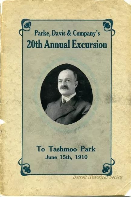Program booklet for the Parke, Davis & Co.'s 20th Annual Excursion to Tashmoo Park on June 15th, 1910. Includes athletic events and amusements, facts about Detroit, and black and white photos of company executives and activities from the 1909 excursion. Mr. F.G. Ryan is featured through the front cover cutout.