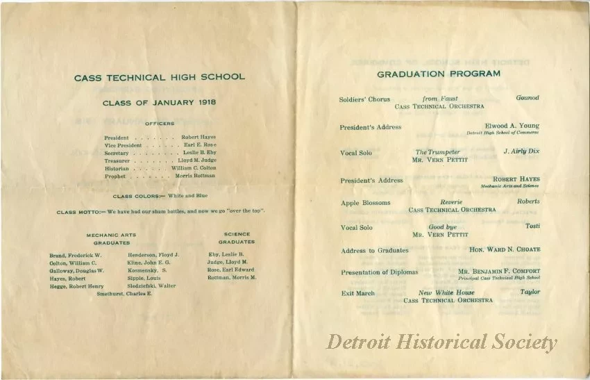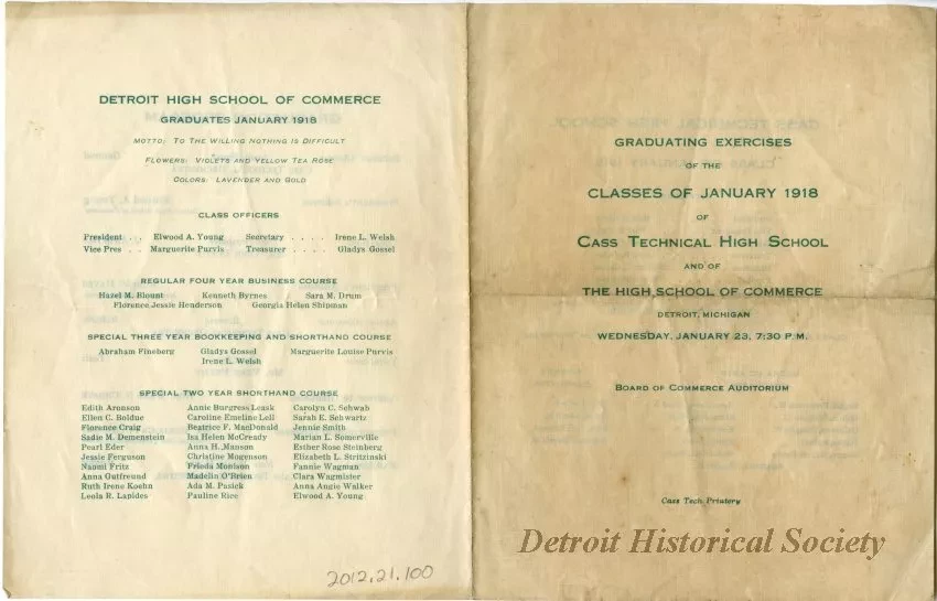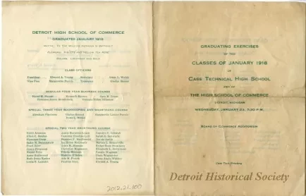 Half-folded program for the classes of January 1918 graduating exercises for Cass Technical High School and the High School of Commerce, held on Wednesday, January 23 at the Board of Commerce Auditorium. Class officers, the class motto, the class colors, and the names of graduates for Cass Tech are listed inside, while those for the School of Commerce are listed on the back page. The sequence of speakers and performances is also listed within.