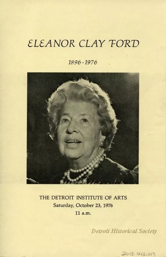 Program from tribute to Eleanor Clay Ford at the Detroit Institute of Arts October 23, 1976, printed on yellow paper. Cover of program has a photo of Mrs. Ford and 1896-1976, as well as the time and place of tribute. Speaker and musical performers are listed inside.